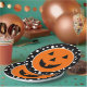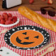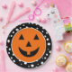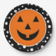 La placa de papel de la fiesta de Halloween se muestra en un diseño de puntos de polka en blanco y negro con la cara de calabaza impresa. Personalizar este artículo o compra tal cual. Se muestra en tamaño de 9". Vendido en paquete de ocho. Imagen de stock
