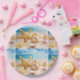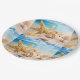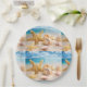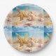 Hermosas conchas en los platos de papel de la playa. También hay disponibles tiras acuáticas y servilletas. También se puede elegir un tamaño y forma de plato diferentes.
