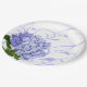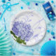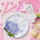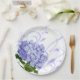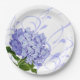 Platos de papel fiesta mostrados en el tamaño de la cena blanca con una impresión de arte de un bonito diseño de hidrangea azul. Ofrecemos una servilleta para que coincida con este plato de papel. Personalizar este artículo o compra tal cual. Imagen de stock