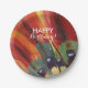 Colorido plato de papel de fiesta de cumpleaños. Pintura de flores para los amantes de la naturaleza. Naranja, verde, pintura amarilla.