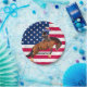 Un caballo balancín y un jinete consiguen algo de aire sobre una bandera estadounidense durante una competencia de toros.