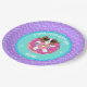 Este plato de la fiesta de cumpleaños personalizado incluye a Sophie, un perro de dibujos animados marrones y blancos, que se relaja en un flotador inflable en forma de rosquilla. Sophie lleva gafas de sol y lleva puesto un traje de baño rosa con un diseño de piña. Los platos fiestas tienen un patrón ondulado y brillan como acentos. El plato fiesta tiene tonos de agua, violeta, rosa claro, blanco y verde menta.