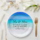 Platos de papel de bodas con una playa tropical de arena. A lo lejos, un magnífico mar turquesa de aguas cristalinas acaricia una playa de arena. Un cielo azul brillante en el fondo.