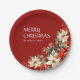 Feliz Navidad y nombre familiar Poinsettias placa redonda de papel. Texto de personalizable en la esquina superior izquierda con acuarela blanca y roja Poinsettias, bayas y follaje en la esquina inferior derecha para hacer el texto y el diseño en texto blanco equilibrado sobre un fondo base rojo. Un diseño atemporal con flores de invierno para su temporada de Navidades o eventos año tras año. Disponible en diferentes tamaños y colores de fondo. Mezclar y hacer juego. Vea nuestra colección de Navidades con el diseño de The Watercolor Poinsettia para un look sencillo y coherente para su casa de vacaciones, evento de Navidades y cenas o ideas de regalo atemporal.