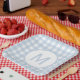 Atrévete a ser diferente con este clásico patrón de cuadros en azul polvo elegante con un lugar circular blanco para agregar tu monograma en una fuente de bloque elegante azul a juego. Reemplaza la inicial con la tuya... elige tu fuente o elimina el monograma y agrega tu propio diseño. Perfecto para baby showers, bodas, aniversarios, reuniones y almuerzos.