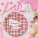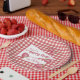 ¡Tiempo de fresa! Los primeros cumpleaños con temática de fresa dulce son ideales para un chica que ama las bayas dulces. El fondo de Gingham para un ambiente casero en la granja que es lo mejor para un fiesta de pasteles, postres con bayas, fruta fresca y todo lo que va con ella. Frutas acuáticas y pequeños acentos cardíacos. Fresa rosa y blanca.