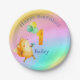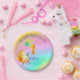 Primer Birthday Custom Name Rainbow Balloons Paper Plates. La plantilla está configurada para que cambie el nombre. También hay servilletas coincidentes.