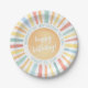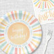 Placa feliz de papel de Cumpleaños. Este alegre diseño de placas de papel presenta un sol vibrante en el centro, con "Feliz Cumpleaños" en la parte superior. Los rayos del sol brillan en una mezcla de amarillo, naranja, rojo, verde azulado y azul, creando un aspecto luminoso y alegre perfecto para un primer viaje alrededor del fiesta de primer cumpleaños del Sol. Personalizable completo, puede ajustar el texto, los colores o los elementos de diseño para que coincidan con el evento. ¡Una adición divertida y festiva al día especial de tu pequeño!