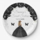 Este elegante y glamoroso plato de dieciséis platos cuenta con una hermosa princesa con el pelo rubio en un vestido de bolas negras. El texto combina el guión manuscrito y las fuentes sans serif modernas para un aspecto elegante y sofisticado. Los arreglos florales, mariposa y confitis de plata crean la combinación perfecta entre rústico y moda. Gráficos de www.etsy.com/uk/shop/SunflowerDayLove