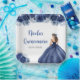 Este plato de Quinceanera cuenta con una hermosa princesa en un vestido de bola azul marino con arreglos florales. Es perfecto para un fiesta quinceanera dulce.