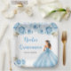 Este plato de Quinceanera cuenta con una hermosa princesa en un vestido de bola azul con arreglos florales. Es perfecto para una fiesta de cumpleaños de Quinceanera.
