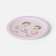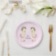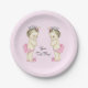 Adorables princesas gemelas bebé niñas que llevan pantalones de volantes y zapatillas de conejo, platos de regadera de bebé niña gemela. Estos platos de papel para regadera de bebé gemela pueden ser personalizados con texto en el estilo de letra y color de su elección, y puede elegir el color de fondo.