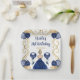 La invitación a este plato de cumpleaños incluye un marco dorado elegante, una bella princesa con el pelo rubio y un vestido azul marino, flores y un globo. Esto es perfecto para una fiesta de cumpleaños.
