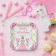 La invitación a este plato de cumpleaños incluye un marco dorado elegante, una bella princesa con el pelo rubio y un vestido rosa, flores y un globo. Esto es perfecto para una fiesta de cumpleaños.