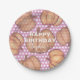 This charming and whimsical party plate is ideal for a fall birthday celebration. It showcases a dark pink and white polka dot backdrop adorned with adorable orange and brown pumpkins painted in watercolour. You can personalise it with the birthday child’s name and birthdate. Perfect for autumn children’s birthday parties.