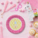 Platos de papel de primera fiesta de cumpleaños con temática de polika punteada rosa y amarilla. ¡Qué dulce para una niña! Algunos gráficos de www.jwillustrations.com
