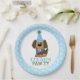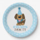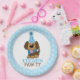 Este lindo plato presenta un perro marrón en un gorra fiesta con un borde azul para la huella y texto personalizado. ¡Perfecto para cualquier cumpleaños de edad!