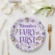 Adorned with an enchanting watercolor purple floral landscape, these personalizable Fairy First birthday party plates set the tone for a magical day as fairies in ethereal purple dresses and their purple butterfly friends flutter and twirl amongst blooms and mushrooms.
