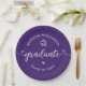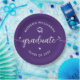 Be proud, rejoice and showcase this milestone of your favorite grad! Celebrate with these simple, modern, bold custom paper plates. Fun white handwritten calligraphy script with cute, playful hearts and a graduation cap icon overlay a purple background. Personalize the custom text with your graduate’s name and class year or special message. Available in 2 sizes: 7” or 9”, round or square. Matching invites, thank you cards, hand fans, banners, yard signs and other graduation goodies are also available in this trendy and playful collection. Guaranteed to add stylish fun to their special party!