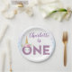 Purpurina púrpura Una Unicornio Primer Cumpleaños Plate Sweet unicorn temática de primer cumpleaños plato de papel para una niña pequeña con una falsa palabra purpurina púrpura, cuerno de unicornio, algunas flores y ojos de unicornio. Ideal para una fiesta de primer cumpleaños con temática de unicornio.