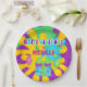 Decore su fiesta con estilo con este magnífico y colorido plato de cumpleaños. Tiene un diseño colorido que incluye manchas purpurinas y colores de rosa caliente, púrpura, verde neón, amarillo y azul neón. La placa de cumpleaños también incluye el nombre de su hijo y está disponible en varios tamaños y formas.
