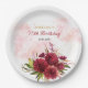El elegante y elegante plato de papel de cumpleaños florido presenta una impresionante dahlia color agua burdeos y flor rosa con purpurina dorado.