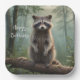 Estas placas de papel muestran un adorable mapache en el bosque en una mañana nublada. Perfecto para cumpleaños y amantes de la naturaleza. El texto se puede cambiar o eliminar.