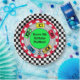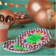 Cumpleaños del niño con autos de carrera y huellas, placas de papel de cumpleaños a cuadros.