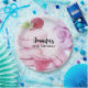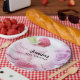 Platos de papel con una deliciosa fotografía que incluye una torre de macarones rosas con frambuesas colocadas alrededor. Muy divino.