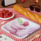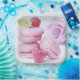 Platos de papel con una deliciosa fotografía que incluye una torre de macarones rosas con frambuesas colocadas alrededor. Muy divino.