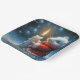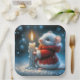 Un pequeño ratón con un abrigo rojo de invierno sostiene una vela rodeada de copos de nieve que caen suavemente