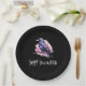 Placas de papel con la imagen de un cuervo negro con alas rosadas violetas. Una mancha acuática rosa detrás de este bonito pájaro místico.