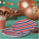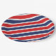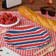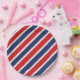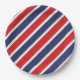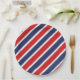 Se muestra una placa de papel de fiesta con un estampado de rayas rojas, blancas y azules patrióticas.