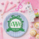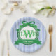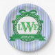 Este elegante plato de papel presenta un fondo atemporal a rayas azules y blancas, que recuerda a los diseños clásicos costeros y preppy. Un monograma personalizado está bellamente enmarcado dentro de un borde de llave griega y adornado con un encantador lazo verde. Ideal para fiestas con tema náutico, reuniones de verano, celebraciones al estilo sureño o brunch preppy, este plato elegante añade un toque sofisticado a cualquier evento.