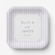 Este elegante plato de boda presenta un diseño minimalista con rayas verticales en lavanda suave y blanco, creando un telón de fondo sofisticado. El rectángulo central destaca el texto personalizable en una fuente serif limpia para nombres y fecha, ofreciendo una apariencia moderna y sin embargo atemporal. Perfecto para ocasiones formales, el encanto discreto de este diseño lo hace ideal para bodas o celebraciones especiales, transmitiendo un ambiente de refinamiento y claridad.