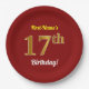 Este sencillo, personalizado diseño de placas de papel con temática de cumpleaños incluye un mensaje de personalizable como "¡Cumpleaños 17 del Nombre!", donde se puede cambiar el nombre, y donde el "17" tiene un aspecto de imitación de oro o imitación. También tiene un fondo de color rojo. Las placas de papel como estas podrían ser usadas en un fiesta que se celebra el 17 cumpleaños de alguien. [~Z0000144]