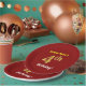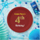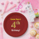 Este sencillo, personalizado diseño de placas de papel con temática de cumpleaños incluye un mensaje de personalizable como "¡El cuarto cumpleaños del Personalizado-nombre!", donde se puede cambiar el nombre, y con el "cuarto" con un aspecto falso/imitación dorado. También tiene un fondo de color rojo. Las placas de papel como estas podrían ser usadas en un fiesta que se celebra el cuarto cumpleaños de alguien. [~Z0000144]