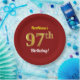 Este sencillo diseño de placas de papel con temática de cumpleaños, personalizado, incluye un mensaje de personalizable como "¡Cumpleaños 97 de FirstName!", donde se puede cambiar el nombre, y con el "97" que tiene un aspecto falso/imitación dorado. También tiene un fondo de color rojo. Las placas de papel como estas podrían ser usadas en un fiesta que se celebra el cumpleaños noventa y siete de alguien. [~Z0000144]