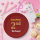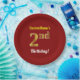 Este sencillo diseño de placas de papel con temática de personalizable y cumpleaños presenta un mensaje de personalizable como "¡Cumpleaños 2 de CustomName!", donde se puede cambiar el nombre, y con el "2º" con un aspecto falso/imitación dorado. También tiene un fondo de color rojo. Las placas de papel como estas podrían ser usadas en un fiesta que se celebra el segundo cumpleaños de alguien. [~Z0000144]