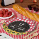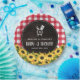 Rústica placa de papel para bebé de gingham roja con grano de madera impreso, girasoles amarillos y utensilios de parrilla cruzados enmarcando tu inicial.