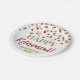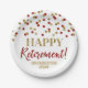 Personalizados felices platos de retiro con un patrón de confeti rojo y oro.