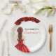 Complete your party decor with these elegant custom paper plates, designed specifically for a grand Quinceañera or Sweet 15 celebration. The design features a stunning illustration of a girl in a vibrant red ball gown, complemented by a crown of red roses and a dusting of gold glitter confetti.