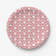 Decorative plate with a red scallop pattern on a white background, shown in two angles: front and slightly tilted. Clean, geometric design.
