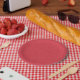 Deep red textured background with soft, swirling patterns resembling marbled fabric. Conveys warmth and subtle elegance.