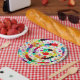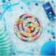 Un diseño divertido con puntos de polka y un gran remolino de colores.