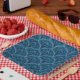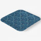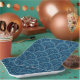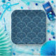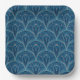 Repeating geometric Art Deco pattern with teal lines and orange dots on a dark blue background, creating a symmetrical and elegant design.