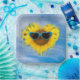 Girasol amarillo con gafas de sol en un marco abstracto en forma de corazón sobre un fondo del cielo de verano.