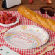 ¡Dos Groovy! Platos de 2º cumpleaños inspirados en el retro con fuentes y colores de estilo años 70.