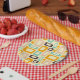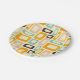 Retro geometric pattern with overlapping rectangles and ovals in orange, teal, pink, and brown on a light beige background, creating a playful, vibrant mood.