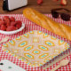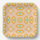 Retro geometric pattern with hexagons and stars in blue, orange, and yellow on a light pink background. The design feels vibrant and nostalgic.